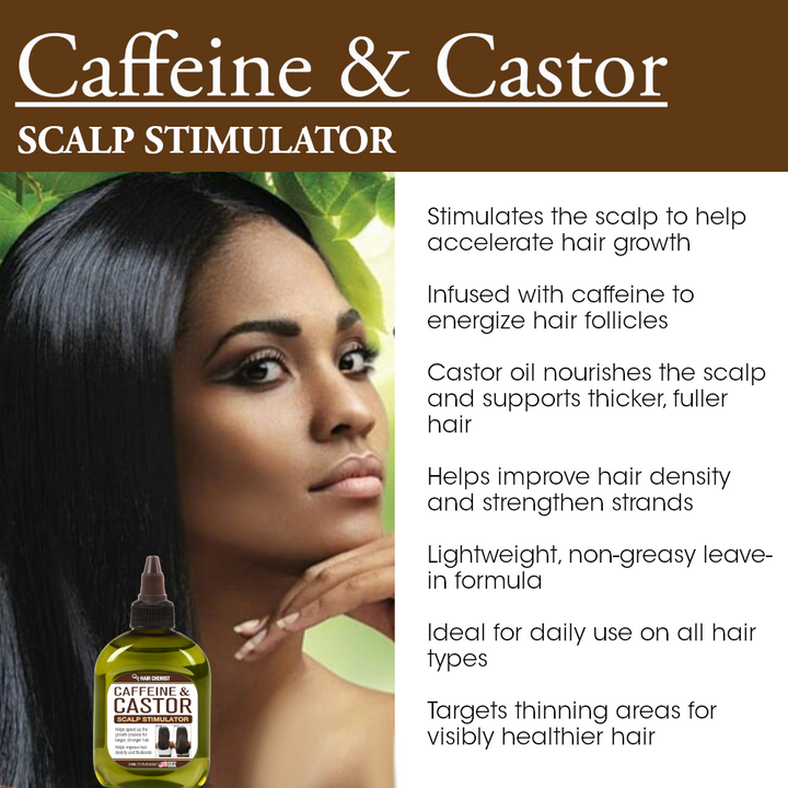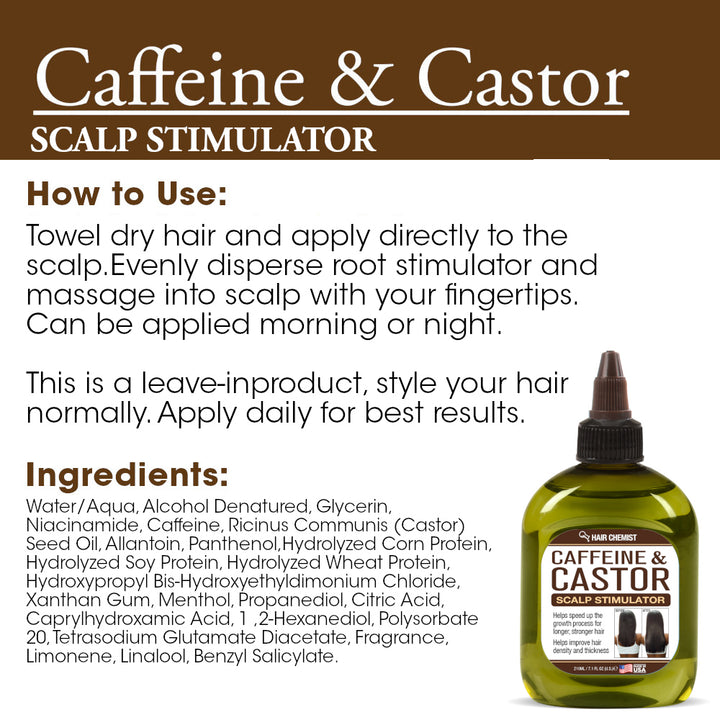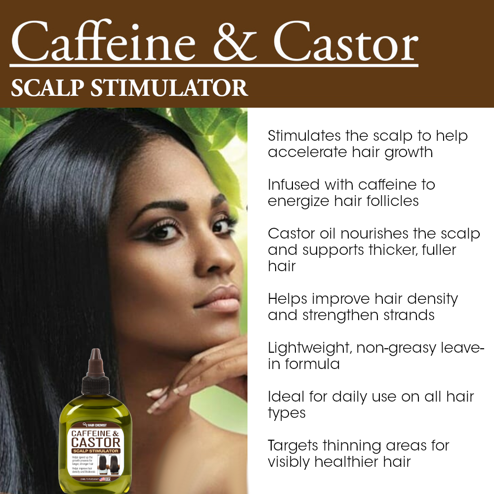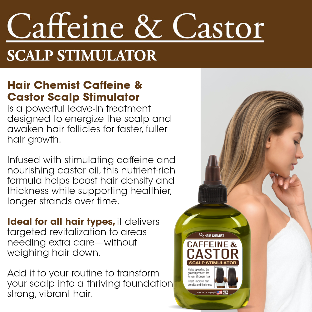 Hair Chemist Caffeine & Castor Scalp Stimulator is a powerful leave-in treatment designed to energize the scalp and awaken hair follicles for faster, fuller hair growth. Infused with stimulating caffeine and nourishing castor oil, this nutrient-rich formula helps boost hair density and thickness while supporting healthier, longer strands over time.