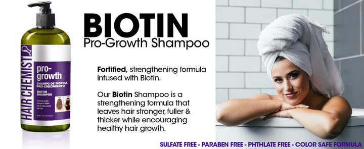 Our Pro-Growth Biotin Shampoo is sulfate free, paraben free, phthalate free. It works to keep your hair color vibrant while giving your hair manageability, softness and shine.