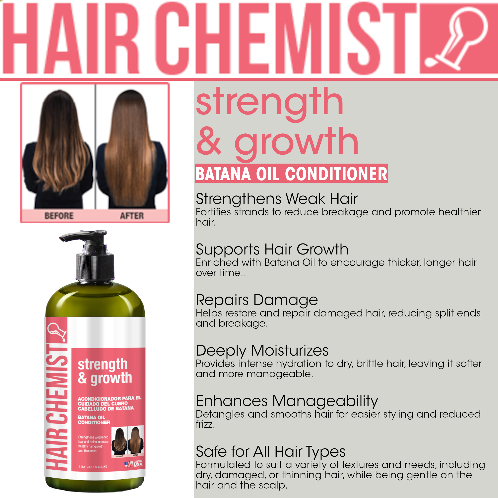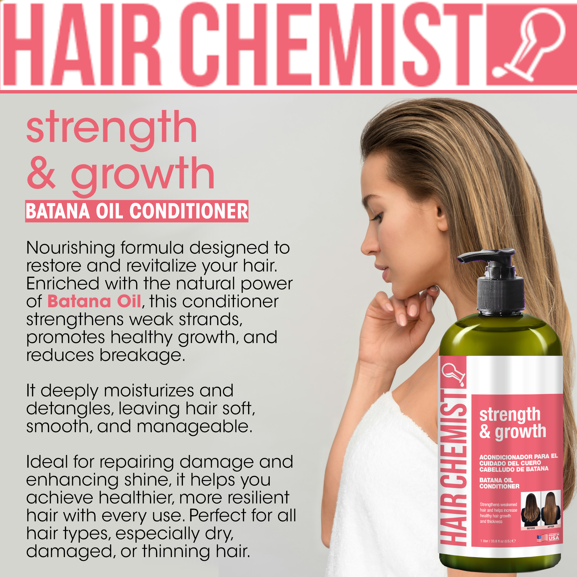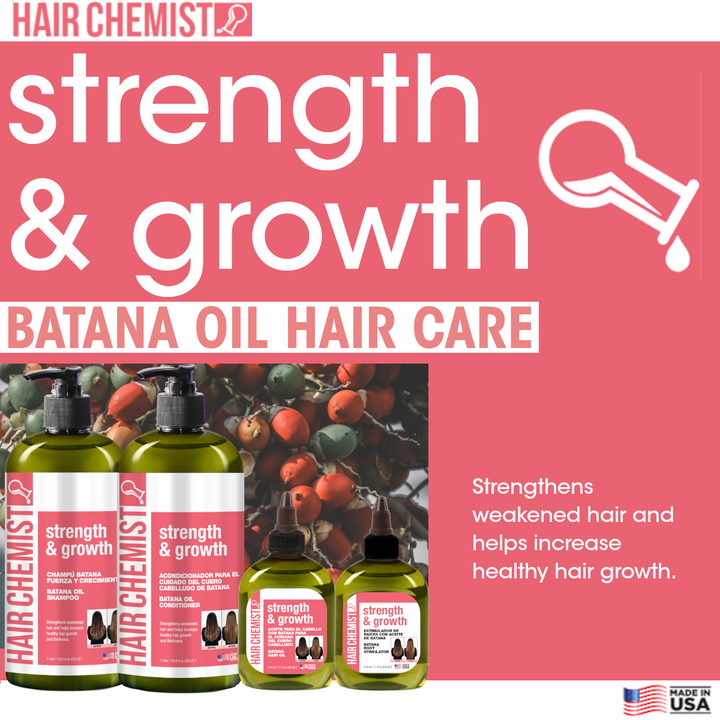 For best results, use after shampooing with Hair Chemist Strength & Growth Batana Shampoo. After shampooing, squeeze out excess water and apply Batana Conditioner. Gently work in and rinse thoroughly.