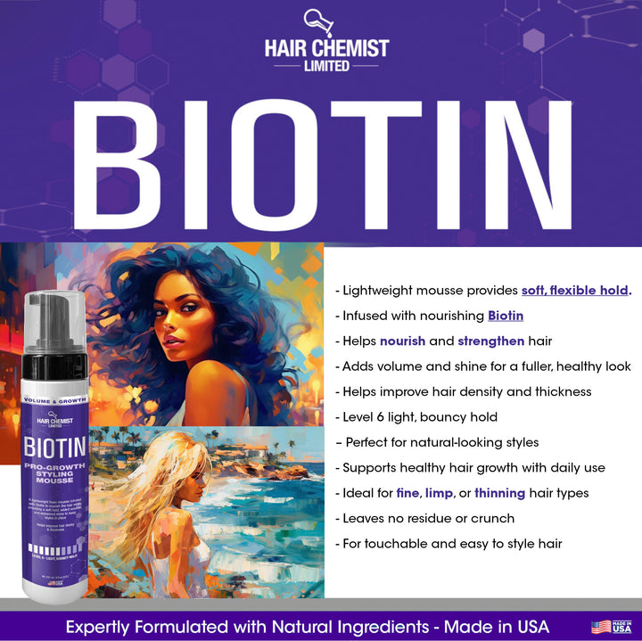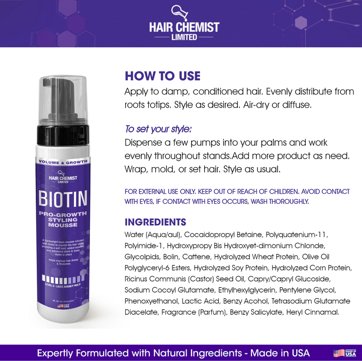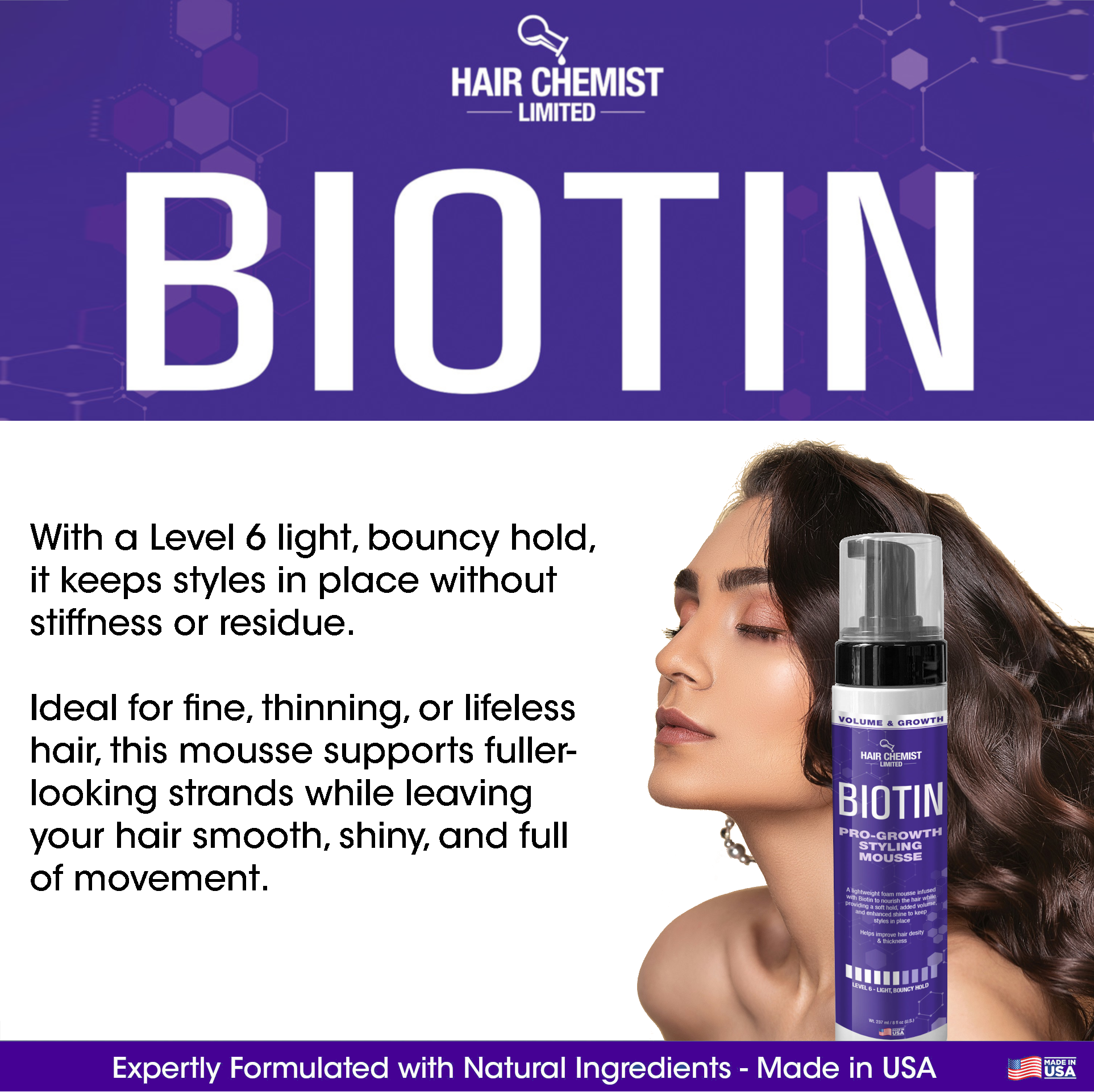 Hair Chemist Volume and Growth Pro-Growth Styling Mousse is a lightweight, biotin-infused foam designed to elevate your styling routine.
